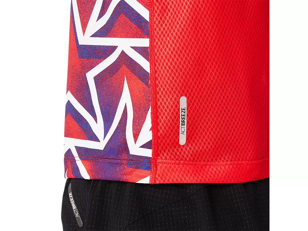 Das Unterhemd zeigt ikonische Symbole und ist farblich an die drei Nationen Japan, Frankreich und die USA angepasst.