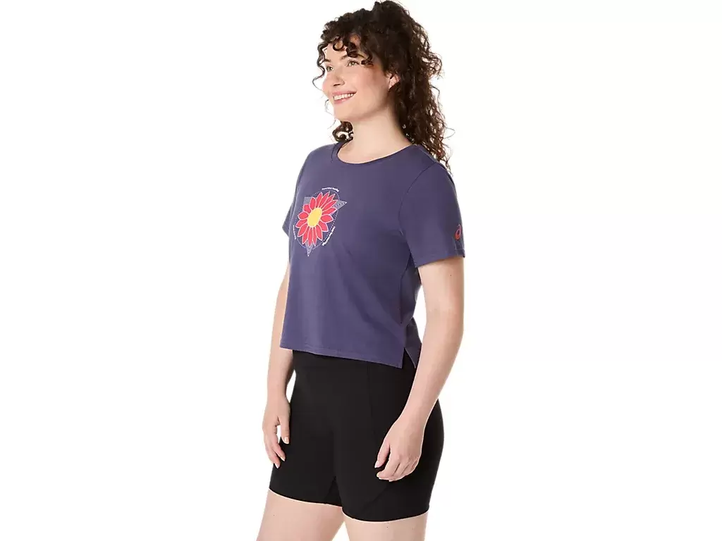 Dieses bequeme, kurzärmlige Strick-T-Shirt hat ein Crop-Top-Design, das durch eine Sonnenblumengrafik auf der Brust akzentuiert wird.
