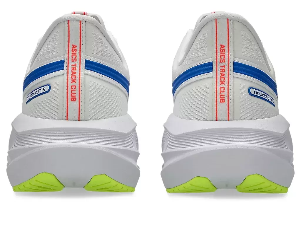 Die Mittel- und Außensohlengeometrie des NOVABLAST® 5 ATC-Laufschuhs sorgt für ein energiegeladenes Laufgefühl. Die Farbgebung ist von Trainingsanzügen und Laufschuhen der 1980er Jahre inspiriert.