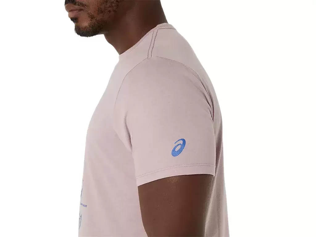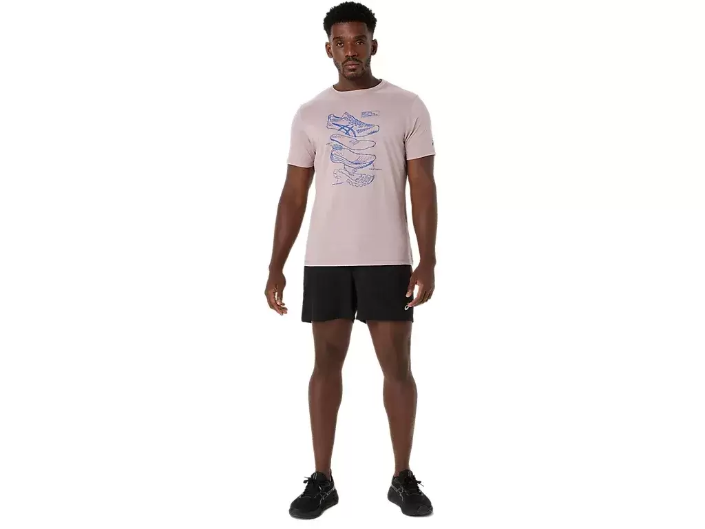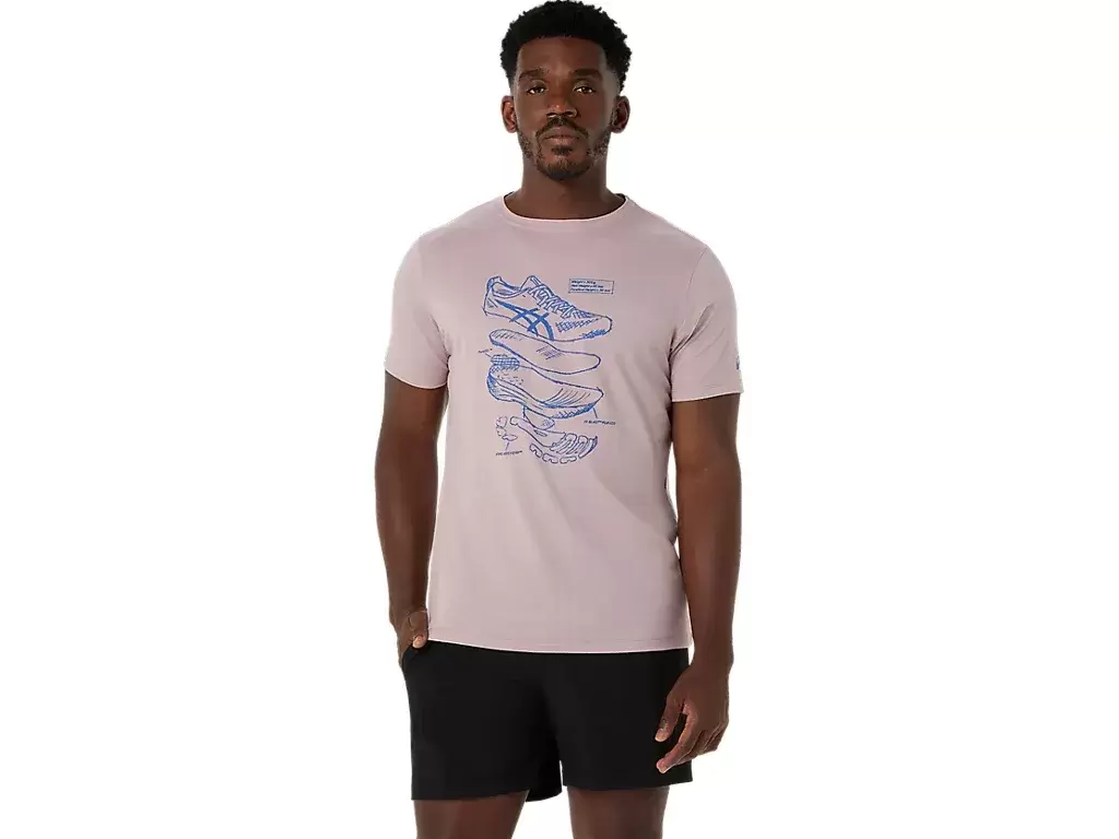 Dieses bequeme, kurzärmlige Strick-T-Shirt ist von den Skizzen der Performance-Laufschuhe von ASICS inspiriert. Es ist mit einer Grafik auf der Vorderseite bedruckt, die die verschiedenen Komponenten zeigt, aus denen unsere Laufschuhe bestehen.