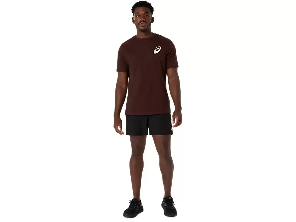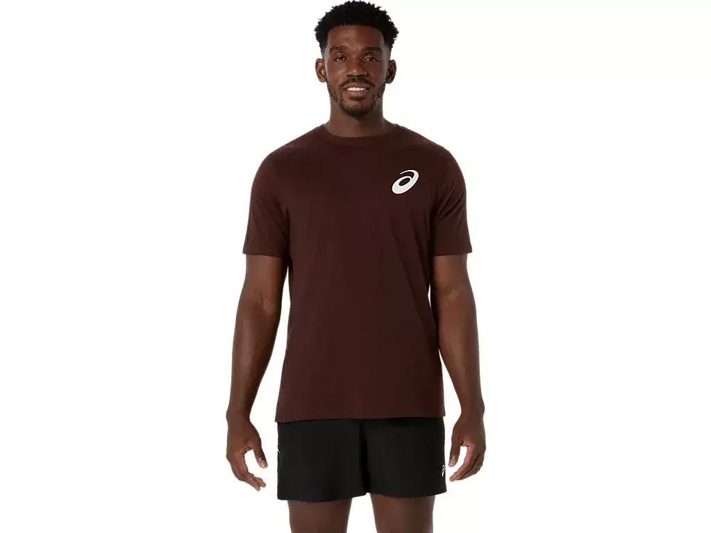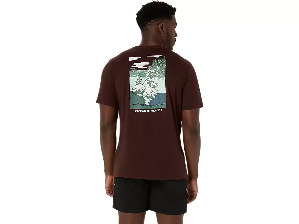 Dieses bequeme, kurzärmlige Strick-T-Shirt ist von Naturszenen inspiriert. Es zeigt eine ruhige Waldgrafik mit dem Satz „EXPLORE WITH ASICS“ auf der Brust.