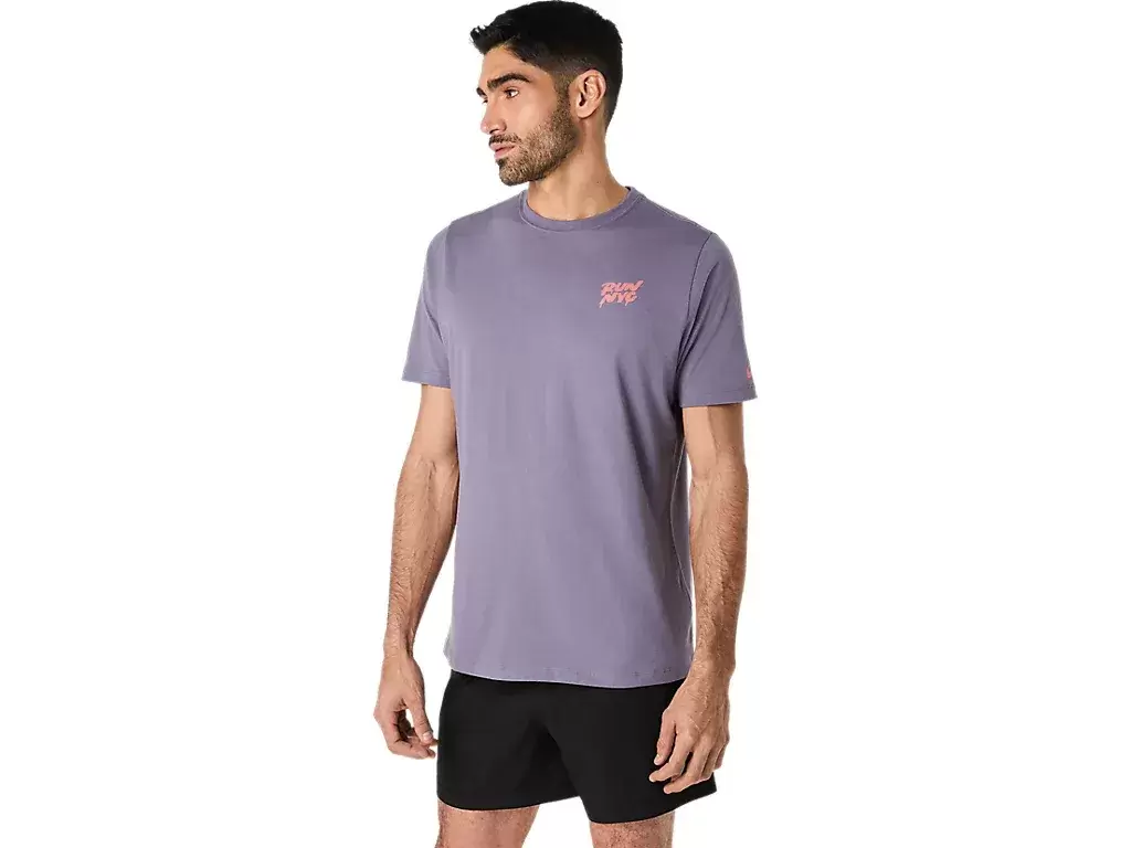 Dieses bequeme, kurzärmlige Strick-T-Shirt ist vom Laufen in New York inspiriert. Auf der Vorderseite steht der Satz „RUN NYC“, der auf der Rückseite durch verschiedene Wahrzeichen von New York City ergänzt wird.