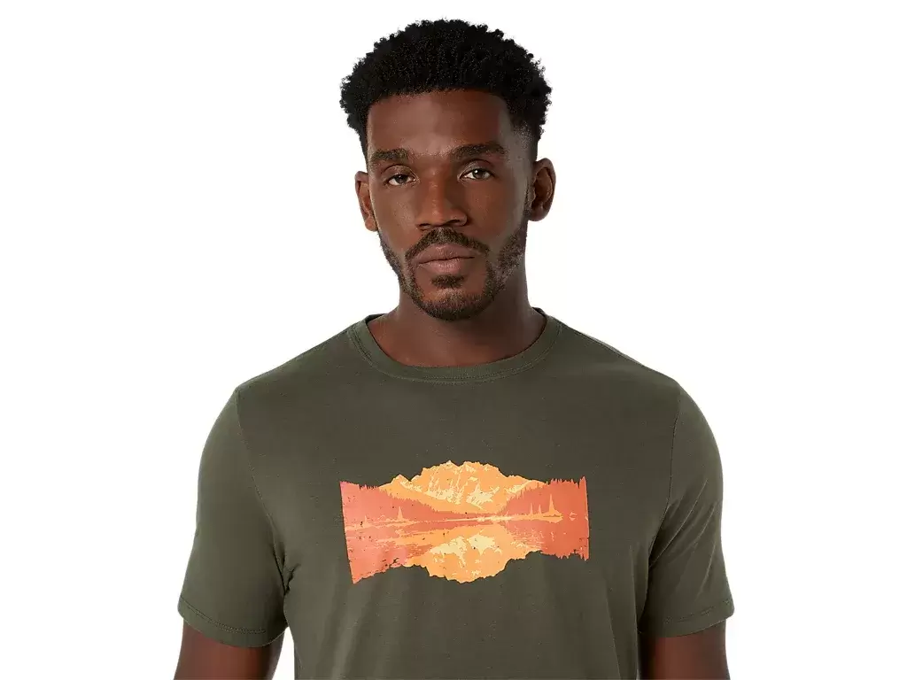 Dieses bequeme, kurzärmlige Strick-T-Shirt ist von der Natur inspiriert. Die Grafik auf der Vorderseite zeigt einen ruhigen See mit Berggipfeln in der Ferne.