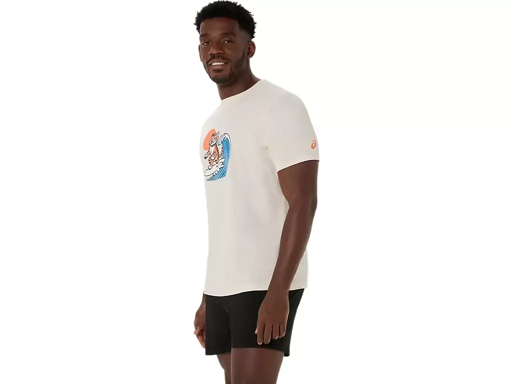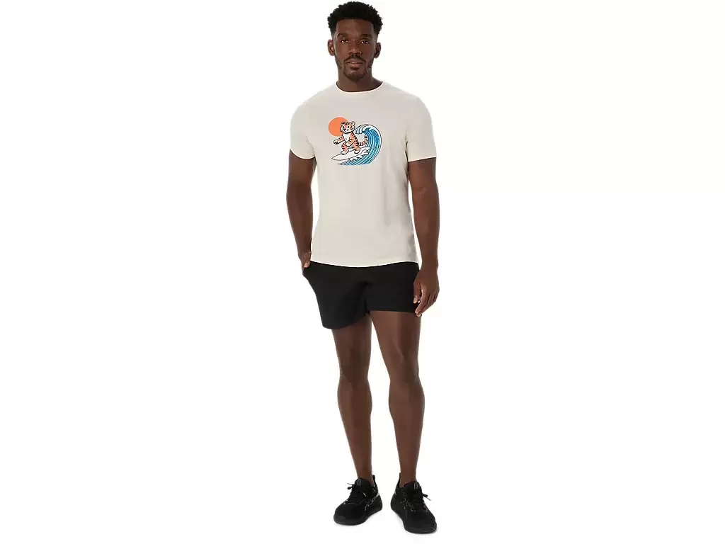 Dieses bequeme, kurzärmlige Strick-T-Shirt ist vom Strand inspiriert. Die Grafik auf der Vorderseite zeigt einen surfenden Tiger, darunter steht der Satz „SUNSHINE ON MY MIND“.