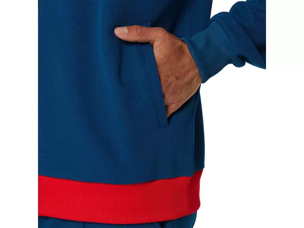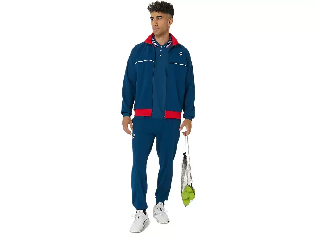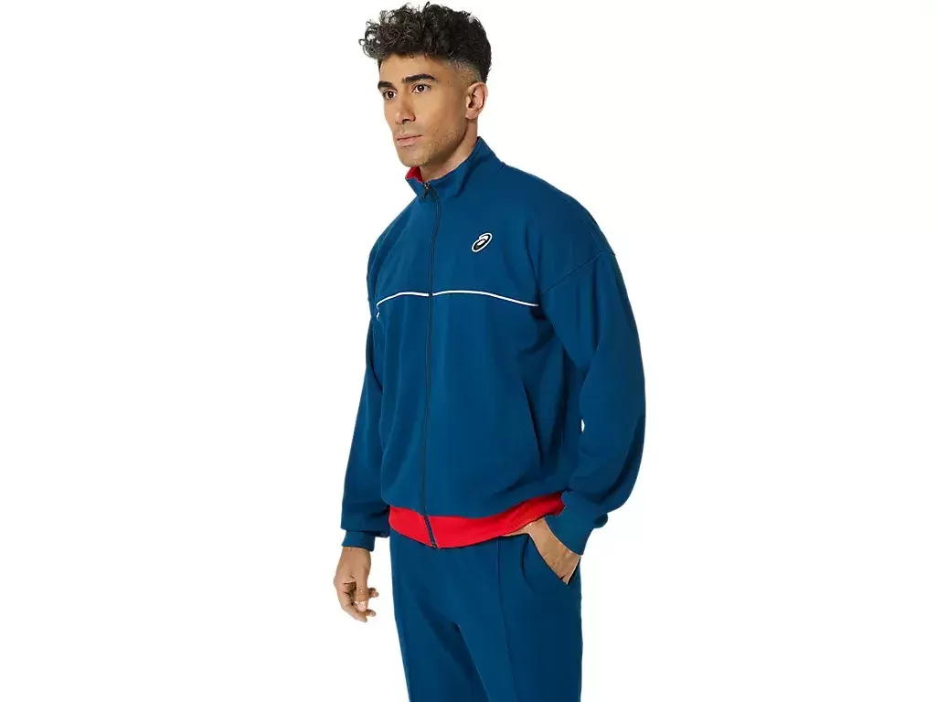 Die CLASSIC KNIT JACKET ist ein bequemes Kleidungsstück zum Aufwärmen auf dem Tennisplatz.